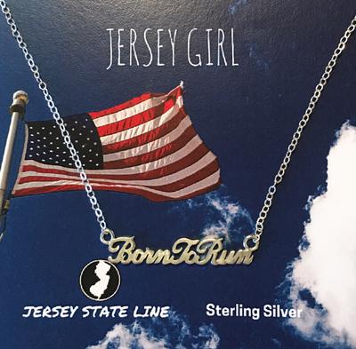 This gorgeous sterling silver "Born to Run" necklace measures 16 inches long (plus scripted font measures approximately 1-1/2 inches wide and 1/4 inch high). Each necklace comes in a lovely box with a "Jersey Girl" picture insert.